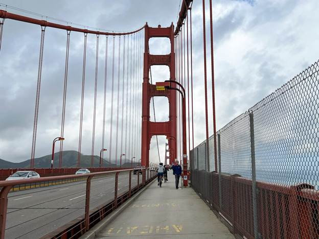 The Golden Gate Bridge is the heart of the city. It is tall, bright red, and sometimes wrapped in cool white fog. When the sun shines on it, the color almost glows.