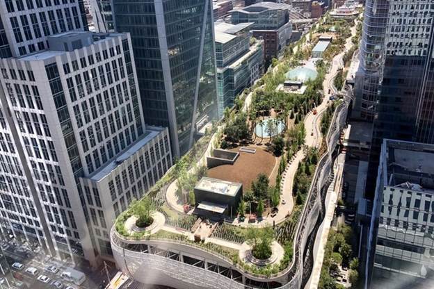Salesforce Park is a modern surprise in the middle of downtown. It is a green park built on top of a busy transit center. There are walking paths, tall plants, and wooden benches. Even though cars and buses move below, the park feels calm and fresh. Birds chirp softly in the trees.