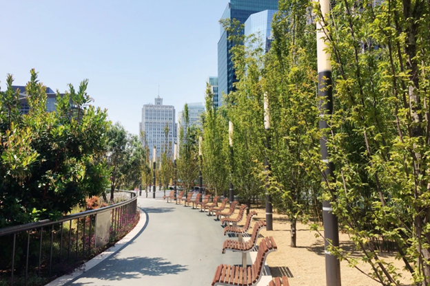 Trees, flowers, walking paths, and wooden benches fill the space. There is even a small track where people walk or jog in circles. It feels modern and peaceful at the same time.