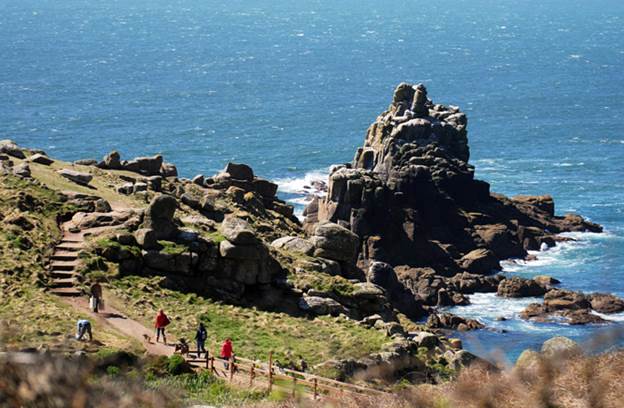 The path curves along cliffs above the water. Waves crash below against dark rocks, and birds fly overhead. In spring, wildflowers bloom along the trail and add bright colors to the landscape.