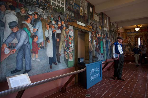 Before you rush to the elevator, take time to look at the murals on the ground floor. These large paintings were made in the 1930s. They show how people in California lived and worked during the hard times of the Great Depression.