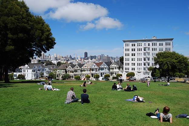 Alamo Square Park is the heart of this area. The grass slopes gently upward, giving you a clear view of the Painted Ladies with downtown behind them. People sit on blankets, lean back on their hands, and enjoy the moment.