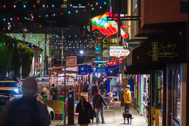 North Beach wakes up after sunset. Music drifts from open doors. Cafes glow with warm light. People talk, laugh, and linger.